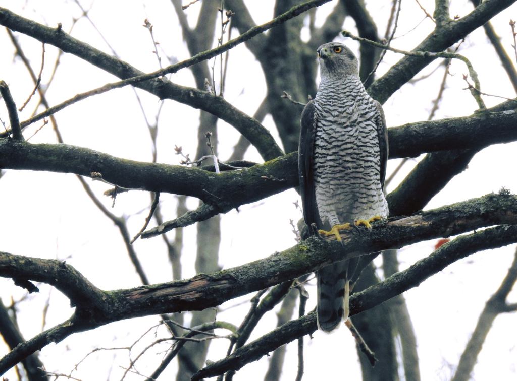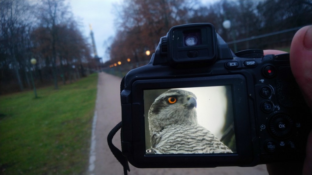 I’ve seen Goshawks before, sure. As barrel-chested silhouettes displaying over breckland or upland clearings. But there is something about the promise of seeing one of these battleaxes of the Palaearctic’s primeval forests in a city park; with joggers and prams and defecating dogs passing under them, which drew me back to Berlin. And it’s just as described. The Goshawks preen, feak specks of flesh off their chops, and just generally stare wild-eyed into a private world of murder and meat while city-life carries on beneath them. The huge flocks of Woodpigeons in the park feed restlessly, constantly looking over their shoulders in a way you don’t see in the UK. A Goshawk culture breeds an untamed air to these urban parks: a carnivorous iron-grey agrestal weed among labelled, imported trees and cyclamen borders. A wildness missing from Britian’s cities – but only a bus away.