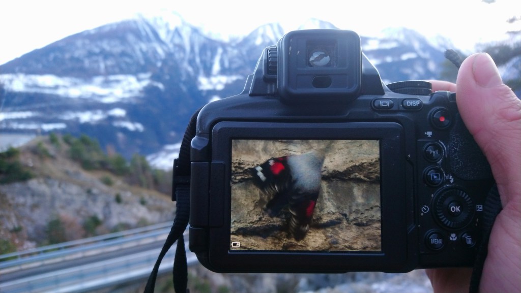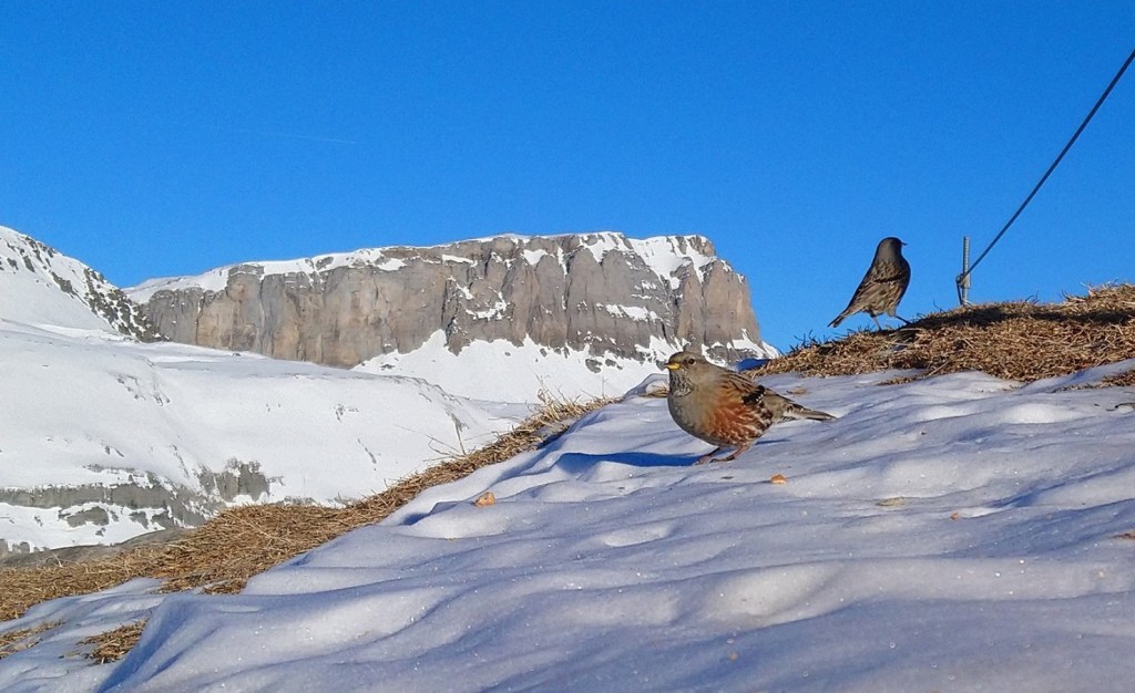 It was then onward to Switzerland, my belly full of pasta and fingers itching to exercise on the focussing wheel of my binoculars. Even Alpine species are not beyond the range of rail and bus birding, if you save a few spare francs for a ski-lift ticket. A couple hour’s travel out of Zürich and I was crashing through the snow of the Gemmi Pass, where Alpine Accentors descend upon any discarded crumbs. I took this photo with my phone.