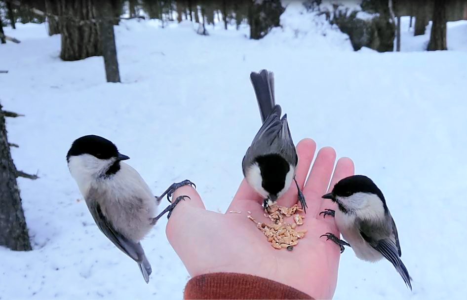 The Bernina railway sends charming red trains crawling across montane bridges, along frozen waterfalls and through the chocolate-box villages of Pontresina, where Ruben and I departed and wandered around the pine forests, occasionally leaping out of the path of wild cross-country skiers. Willow and Crested Tits were easily coaxed down from the branches and into our seed-stocked palms. ‘Black’ Red Squirrels and Spotted Nutcrackers showered snow down on us as they moved through then beard lichens.