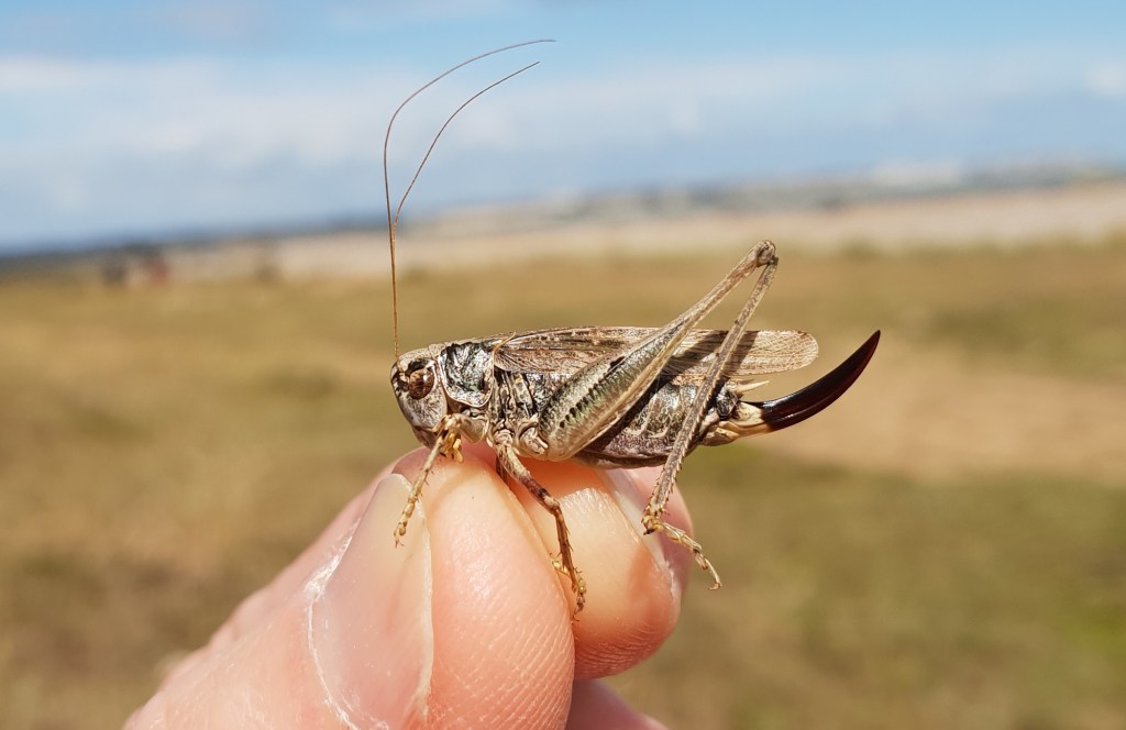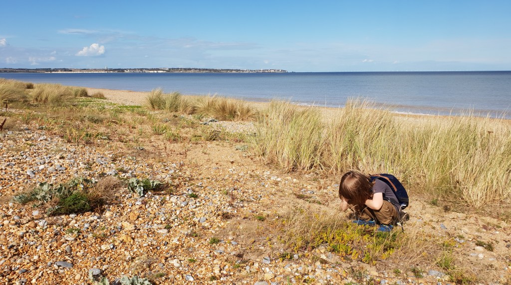 6 September — In late summer and autumn we made several day trips with our five year-old on public transport to see some range-restricted insects in southern England. On 6 September we took the fast train from London to Sandwich Bay and walked out to the low dunes and shingle in search of the Grey Bush-cricket (Platycleis albopunctata). Fraser Simpson
